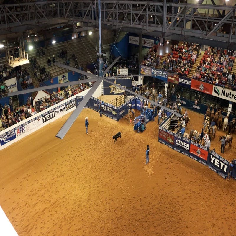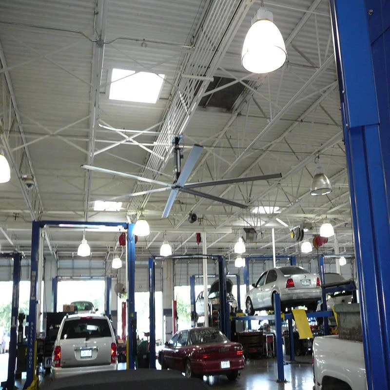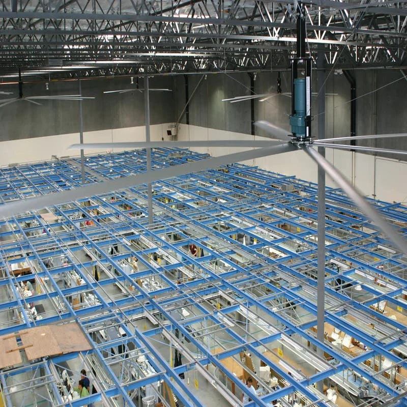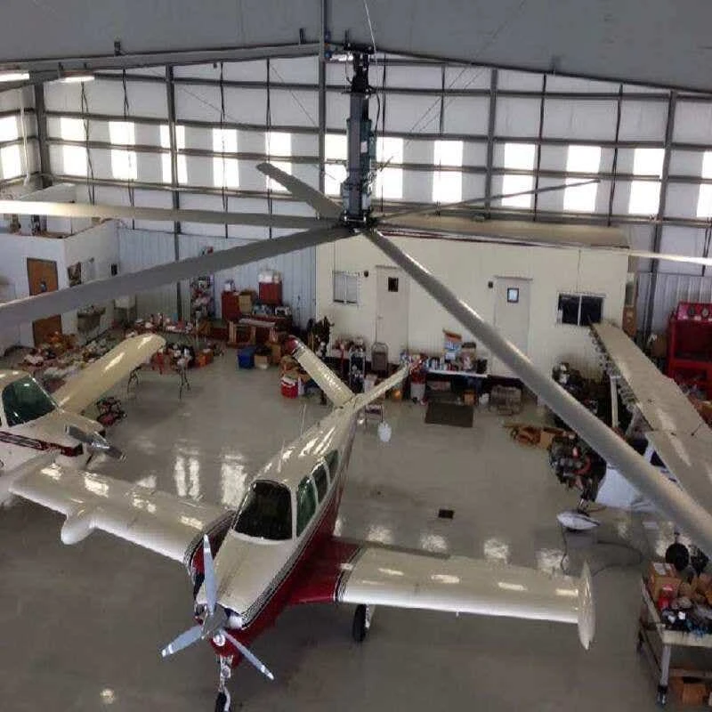 - High Volume Low Speed (HVLS) technology for efficient and effective air movement suitable for a variety of applications including warehouses, manufacturing facilities, sports facilities, event venues, aircraft hangars, agricultural facilities, retail spaces, amusement parks, and automotive service centers.