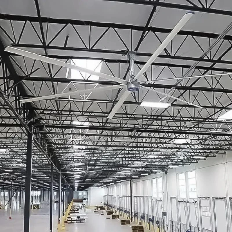 This fan has forward, reverse, and variable speed controller operated. The V-Series is ideal for environments with sound concerns using less than 42 decibels. This fan is a high volume low speed industrial fan that circulates air at a slow speed. The V-Series can provide comfort all year round, if put at a slow speed, it will bring the warm air trapped near the ceiling down to floor level.