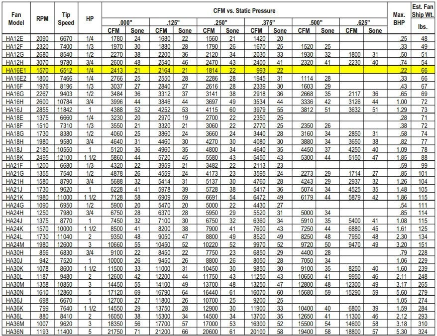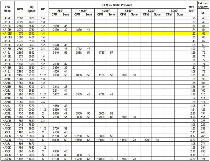 Model HA fan is a belt drive, tubeaxial exhauster with the motor, drives and bearings located outside the airstream. This model has a max CFM of 2,413. The HA is designed to operate in any position and is furnished with mounting flanges on both ends for easy installation.
