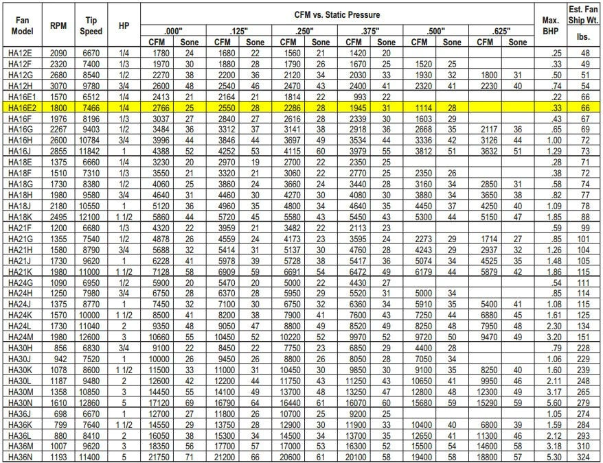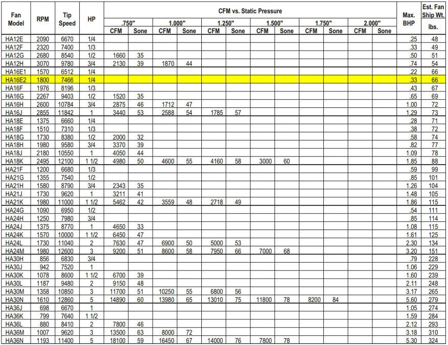 Model HA fan is a belt drive, tubeaxial exhauster with the motor, drives and bearings located outside the airstream. This model has a max CFM of 2,766. The HA is designed to operate in any position and is furnished with mounting flanges on both ends for easy installation.